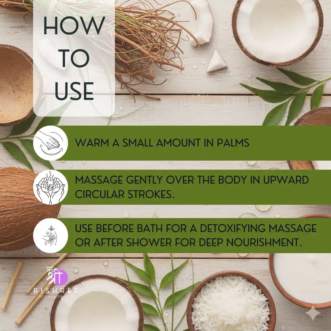 1) Warm a small amount in palms and massage gently all over the body. Ideal as a pre-bath massage in summer or after sun exposure for soothing relief.