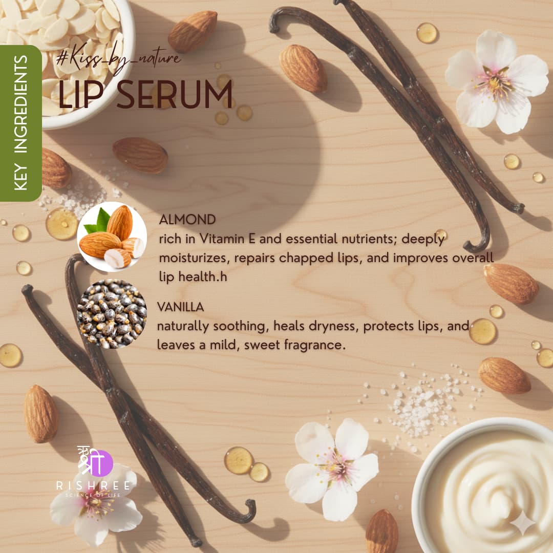 Almond Almond Rich in Vitamin E and essential nutrients; deeply moisturizes, repairs chapped lips, and improves overall lip health.