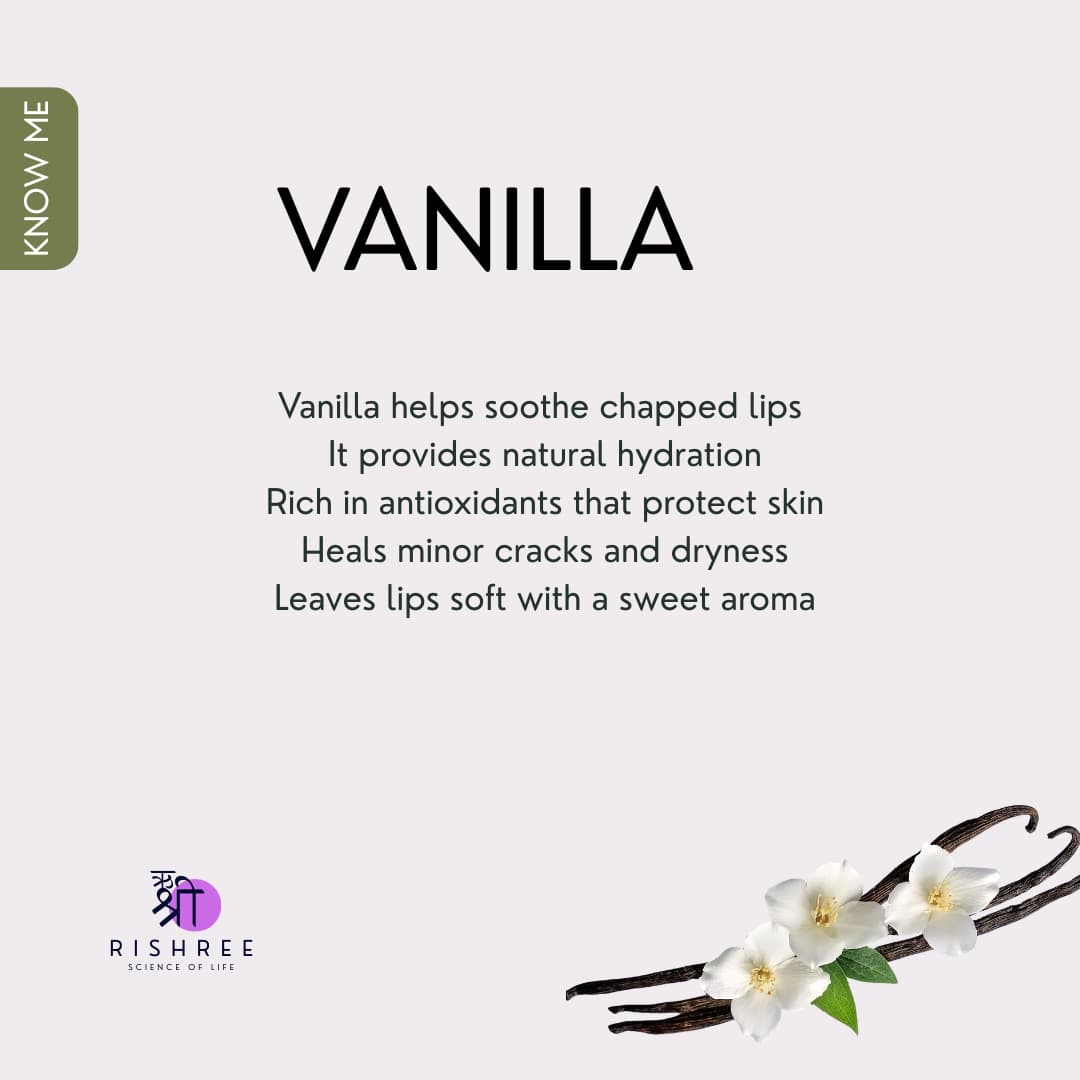 Vanilla Vanilla Naturally soothing, heals dryness, protects lips, and leaves a mild, sweet fragrance.